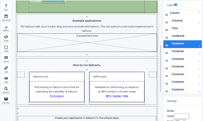 Saltcorn is a platform for building database web applications without writing a single line of code. Use the intuitive point-and-click, drag-and-drop user interface to build your whole application